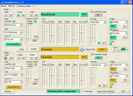 What is Tweak Wizard ? TweakWizard is a powerful tool for tones comparison with a Line6 Flextone III. It's purpose is not to be a competitor for Line6Edit, but to complete it with useful features. The main one is the ability to have two tones in memory, and to swap each other for instant comparison. You can also set the Tuner frequency from 430 to 450 Hz. You can: