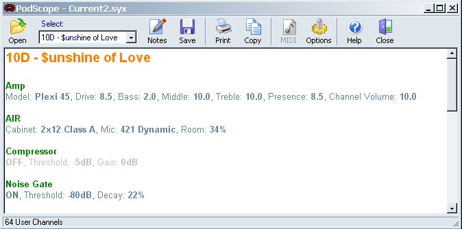How To UseUse PodScope to get your settings via MIDI , or open a PODxt System Exclusive file (plenty of these on the net ;-). You can request and view any of the PODxt settings: current patch, a nominated patch, all channels, amp setups or FX setups. Use the dropdown list to select different patches, if you've loaded more than one. Click the Notes button to add notes to a patch (they're listed at the bottom of the view area) Save to